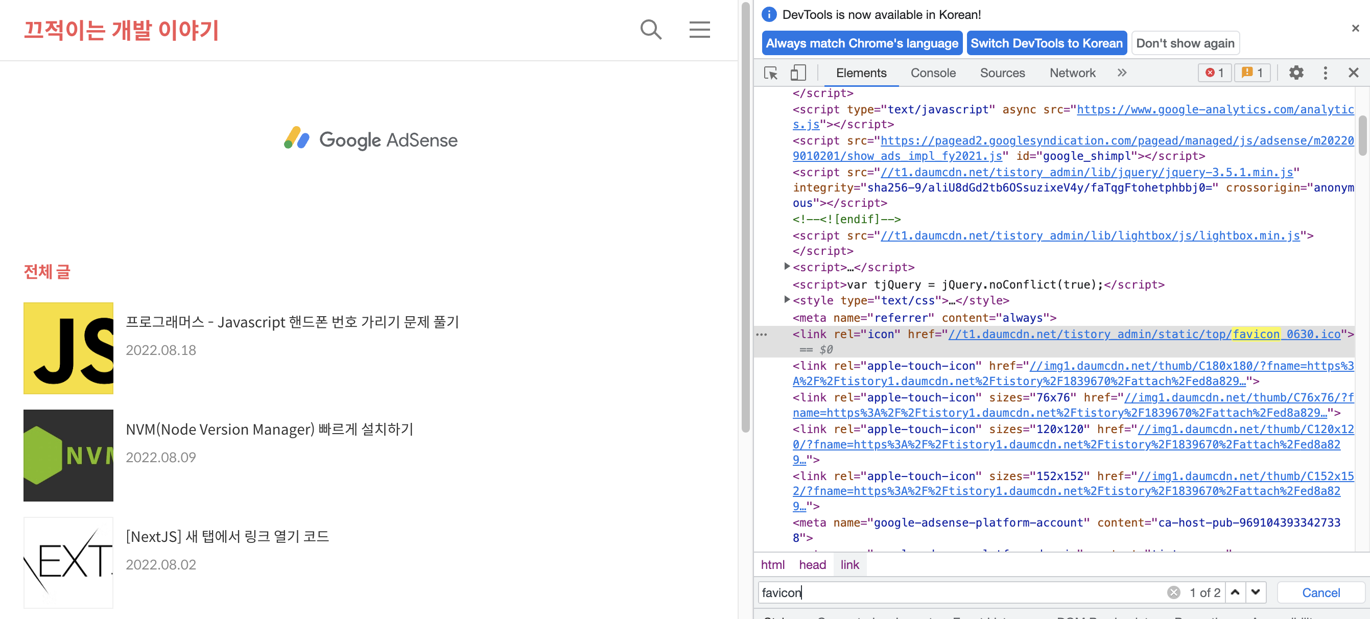 Ctrl + F로favicon을 검색한 후href에 마우스 우클릭을 이용해 새탭으로 열어준다